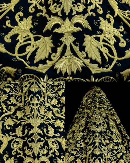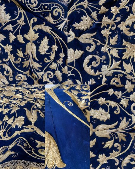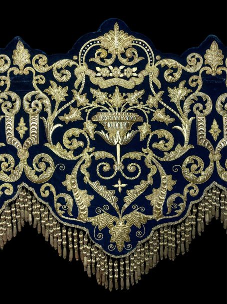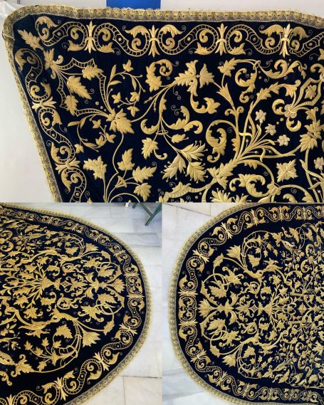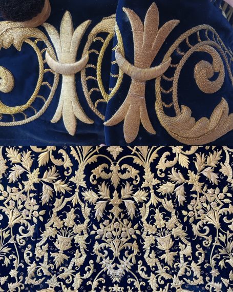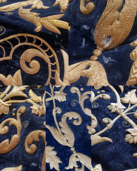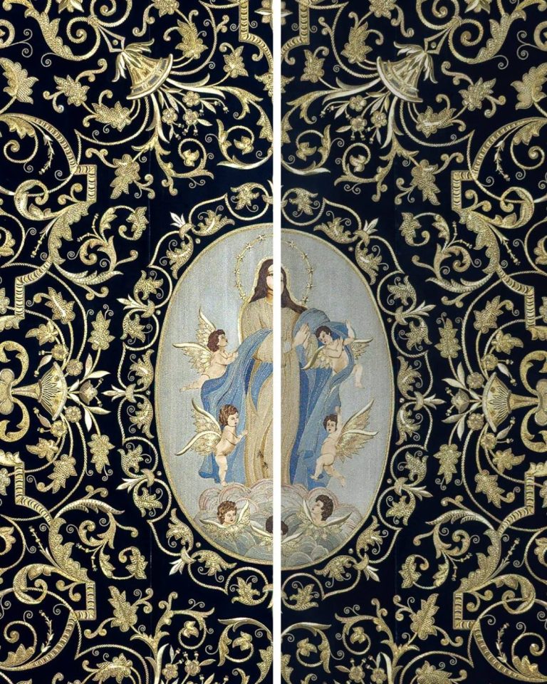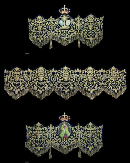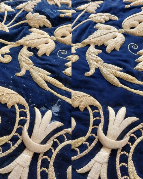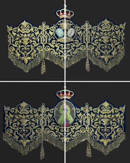En la segunda imagen, tras el trabajo de restauración, se aprecia una notable mejora en el color y la textura del terciopelo, devolviendo profundidad al fondo oscuro. Los bordados dorados han sido cuidadosamente reintegrados y enriquecidos, recuperando su relieve y luminosidad mediante técnicas de limpieza, consolidación y bordado complementario con hilo metálico. Asimismo, los flecos decorativos fueron restaurados y reacondicionados, restituyendo su alineación y su tono dorado original.