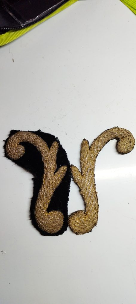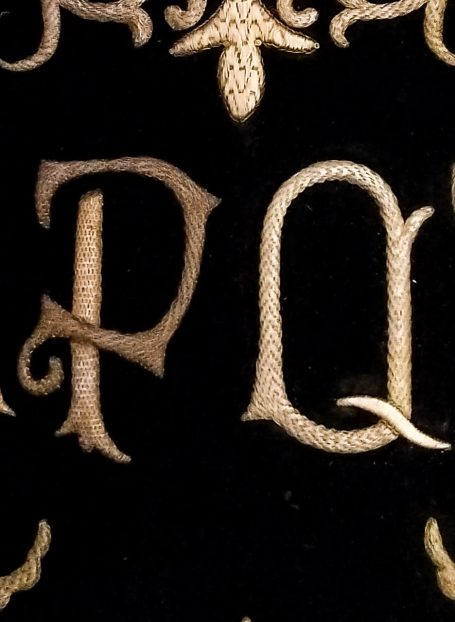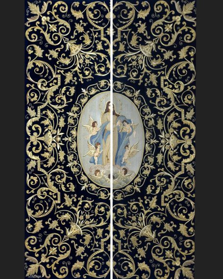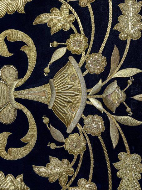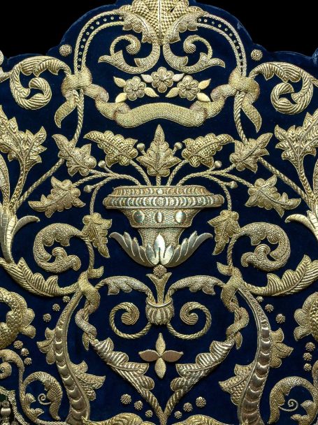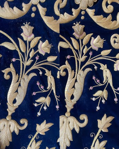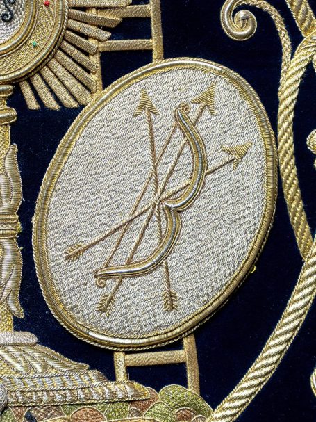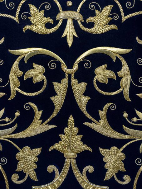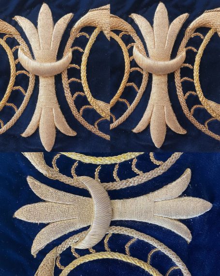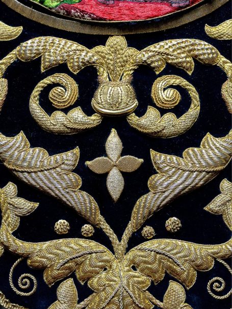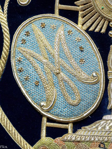 En la segunda imagen, tras el trabajo de restauración, se aprecia una notable mejora en el color y la textura del terciopelo, devolviendo profundidad al fondo oscuro. Los bordados dorados han sido cuidadosamente reintegrados y enriquecidos, recuperando su relieve y luminosidad mediante técnicas de limpieza, consolidación y bordado complementario con hilo metálico. Asimismo, los flecos decorativos fueron restaurados y reacondicionados, restituyendo su alineación y su tono dorado original.