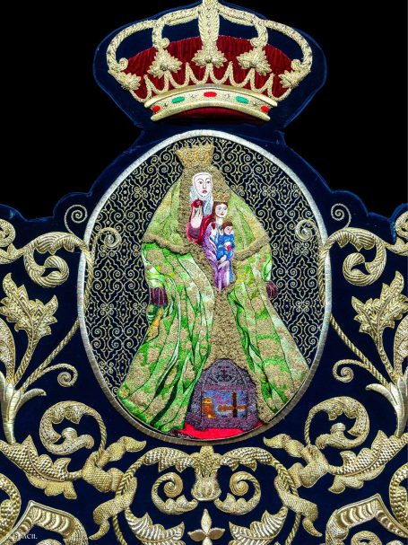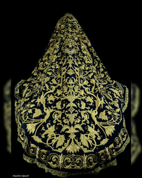 En 1995, el taller de Sucesores de la reconocida bordadora Elena Caro creó este excepcional manto, una joya del bordado en oro sobre terciopelo azul marino para la imagen de María Santísima del Mayor Dolor.