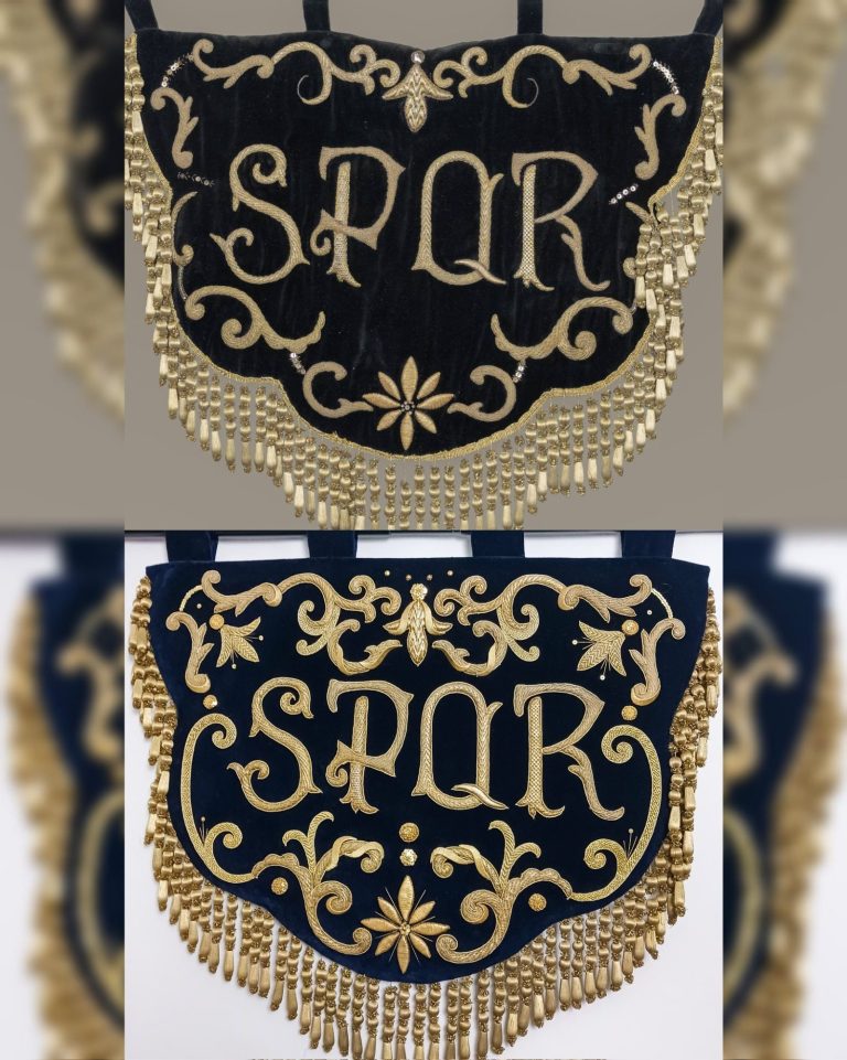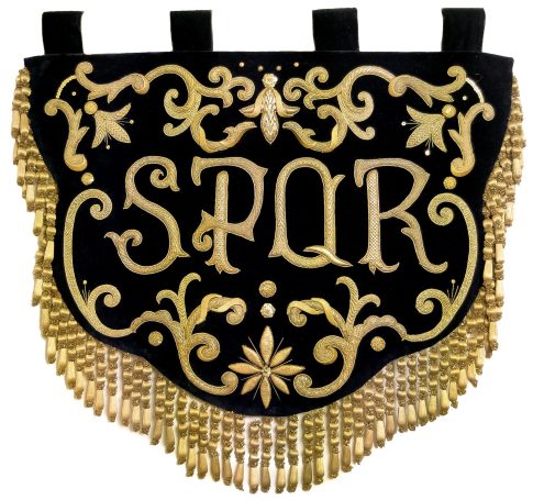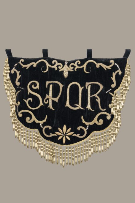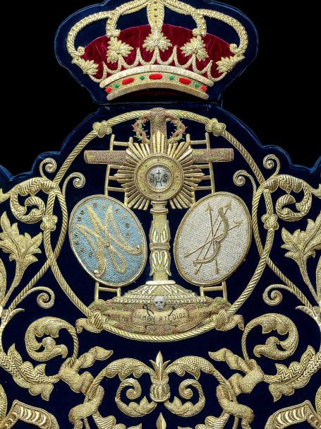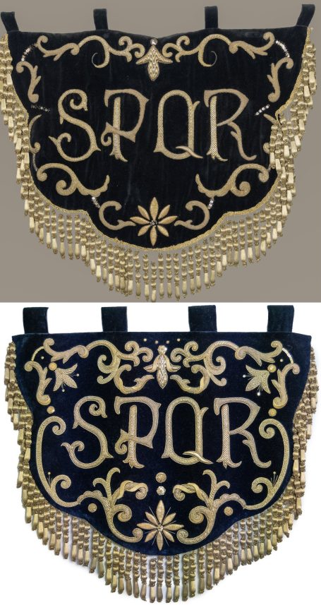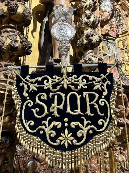 Bajo diseño de Gonzalo Cuevas, mostramos el proceso de restauración y enriquecimiento de un estandarte bordado con las siglas S.P.Q.R. (Senatus), emblema tradicional vinculado al Senado y Pueblo de Roma. En este caso, perteneciente a la Hermandad de la Quinta Angustia de Utrera (Sevilla).