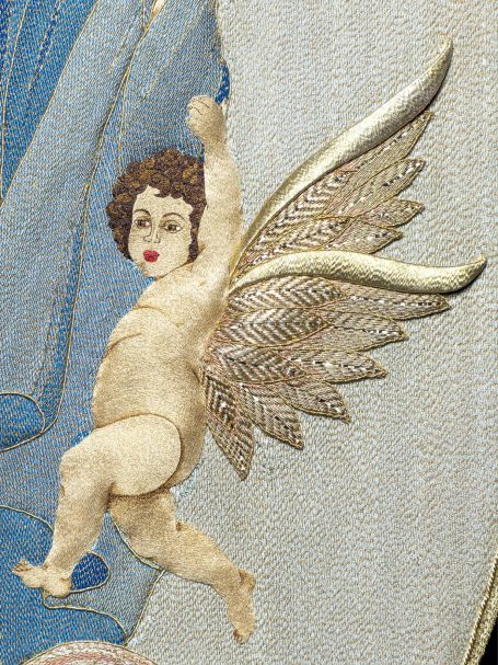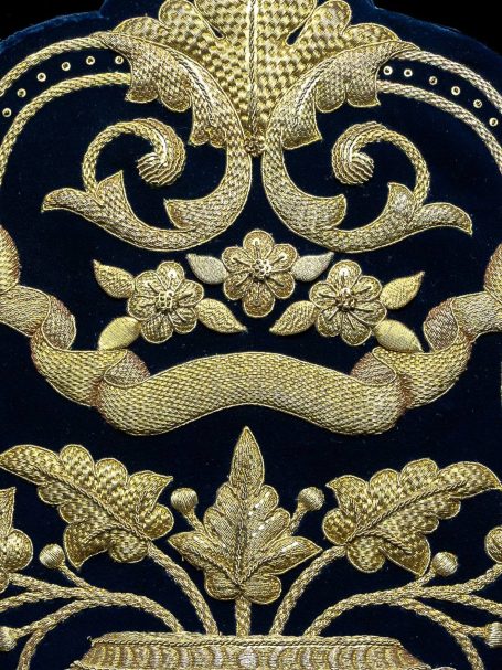 Eliminación cuidadosa de polvo y partículas mediante aspirado con microfiltros, protegiendo los delicados hilos de oro y el soporte, eliminación de residuos y reintegración de todo bordado que lo necesite para su correcto mantenimiento y uso.