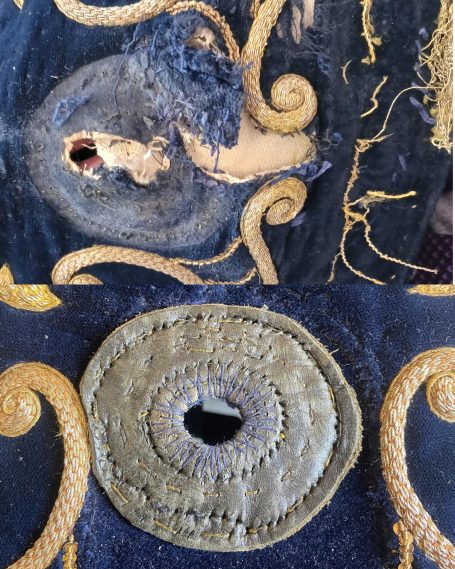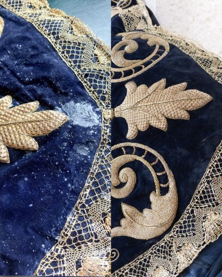 En la primera imagen se observa el estado original de la pieza antes de la intervención. El terciopelo presentaba un tono apagado y evidentes signos de desgaste, mientras que los bordados dorados y los adornos metálicos habían perdido brillo y definición. Algunos detalles ornamentales estaban incompletos o deteriorados, y la estructura textil mostraba cierta deformación.